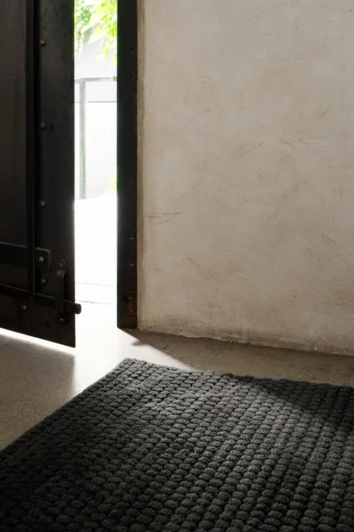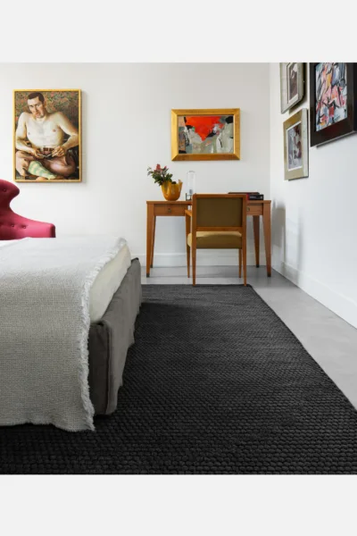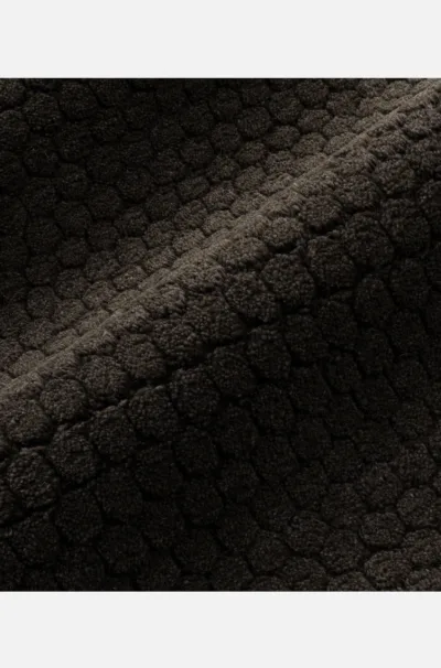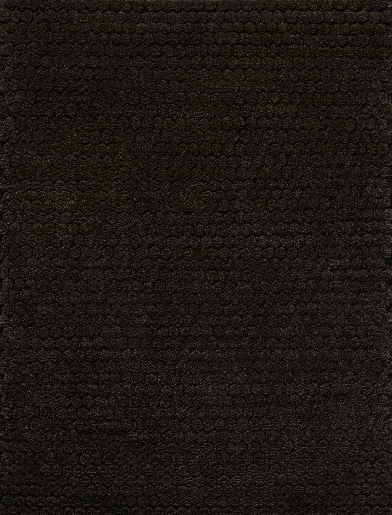 Hexagonal tiling throughout with pile heights emulating the sloping texture of drawn honeycomb, delineated by a soumak weave.