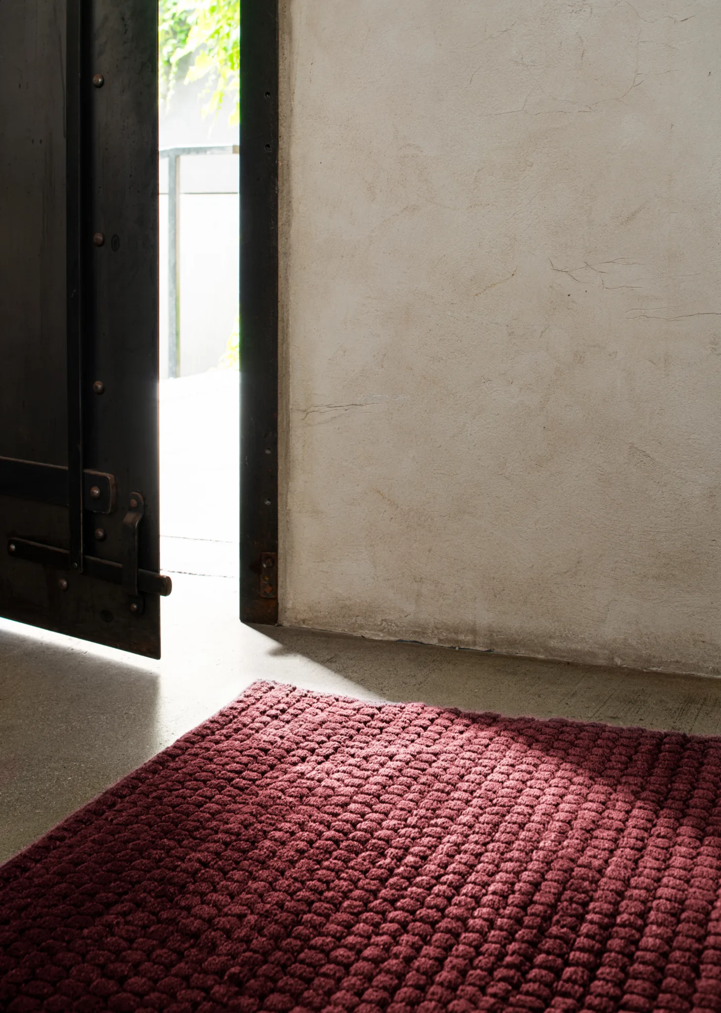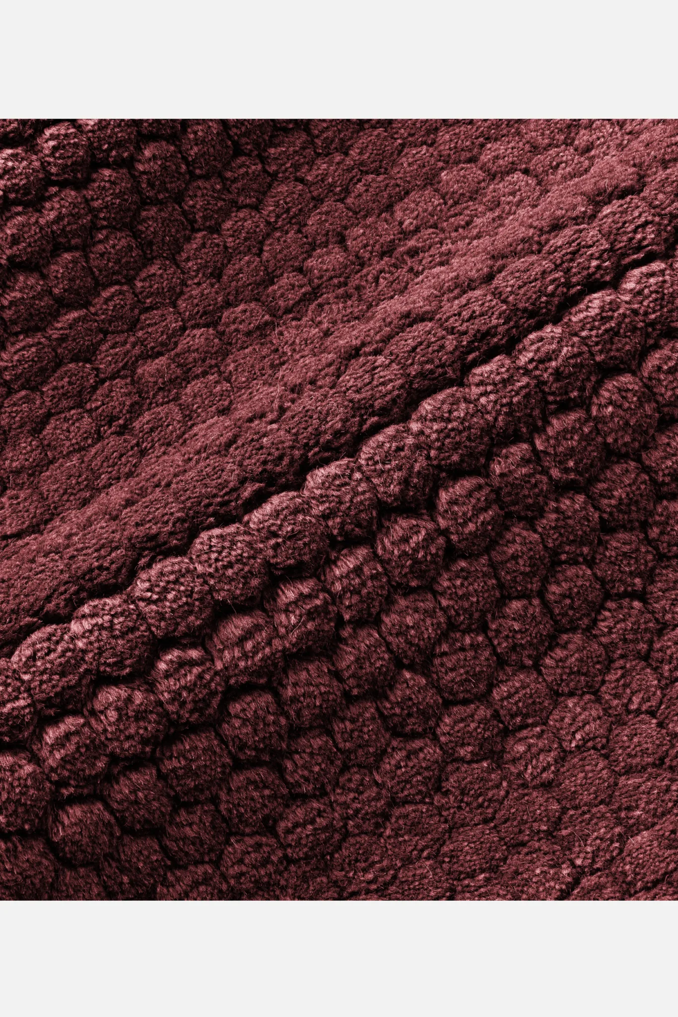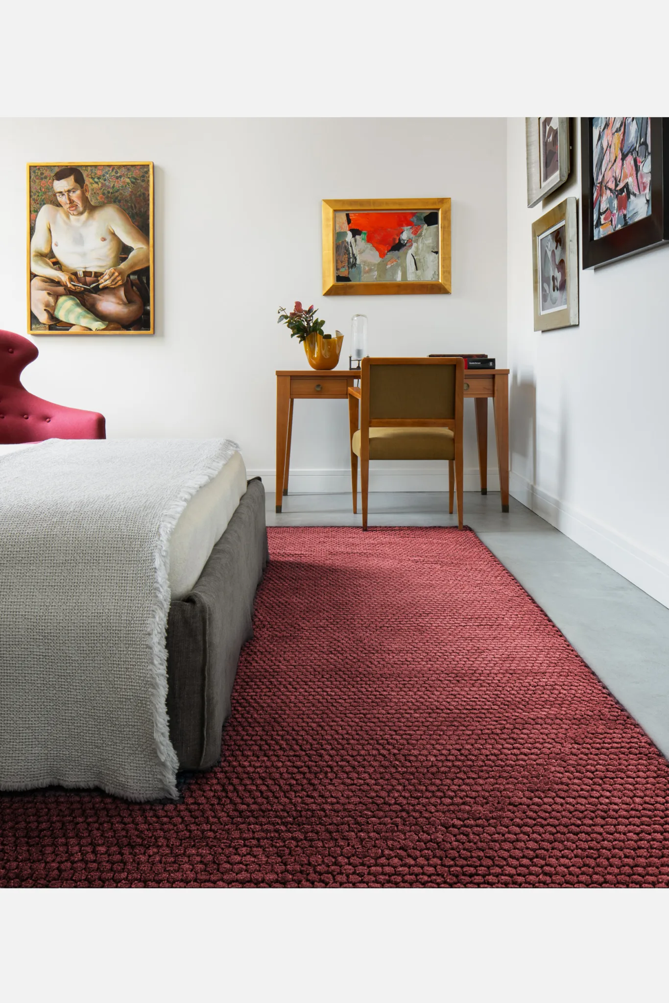 Hexagonal tiling throughout with pile heights emulating the sloping texture of drawn honeycomb, delineated by a soumak weave.