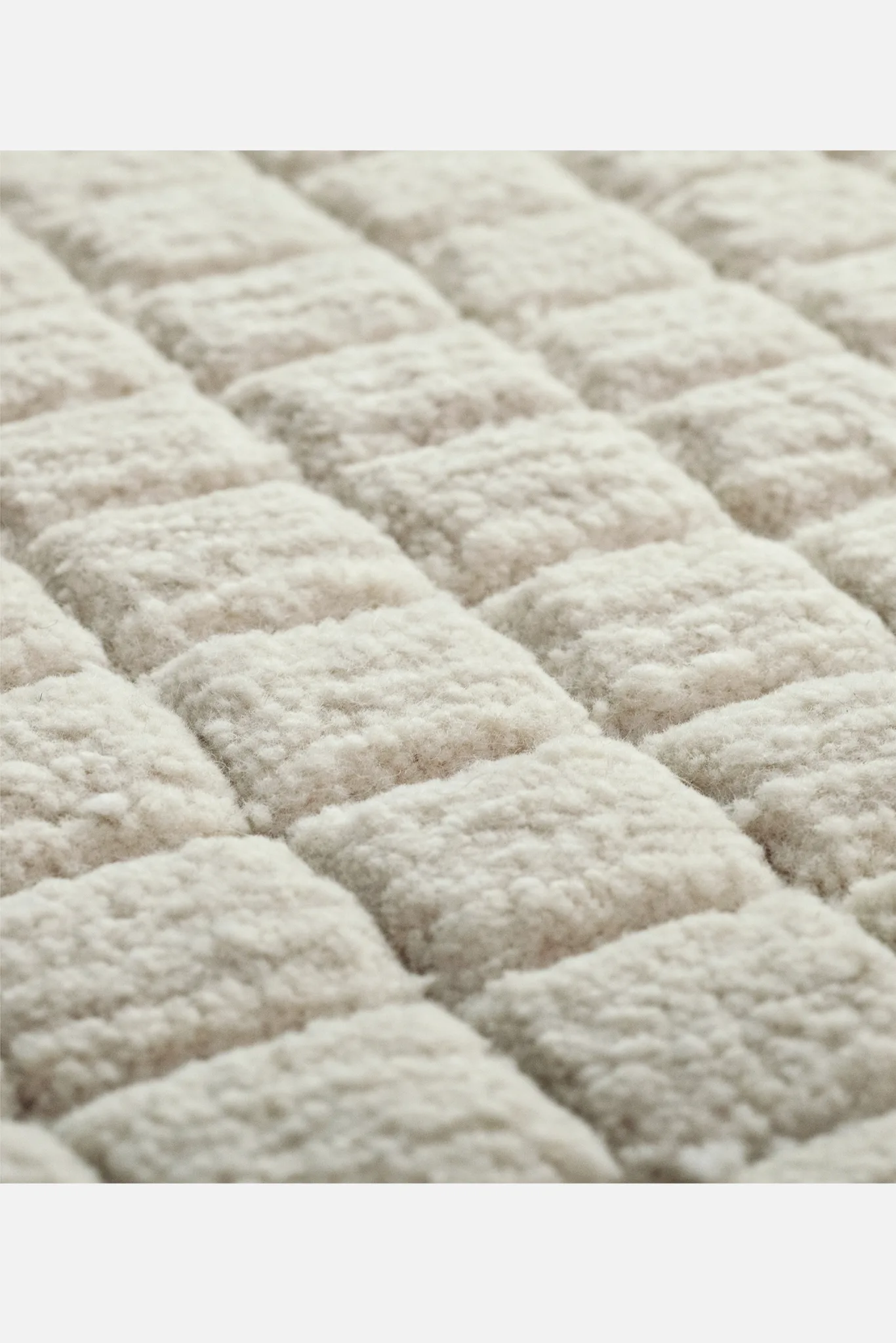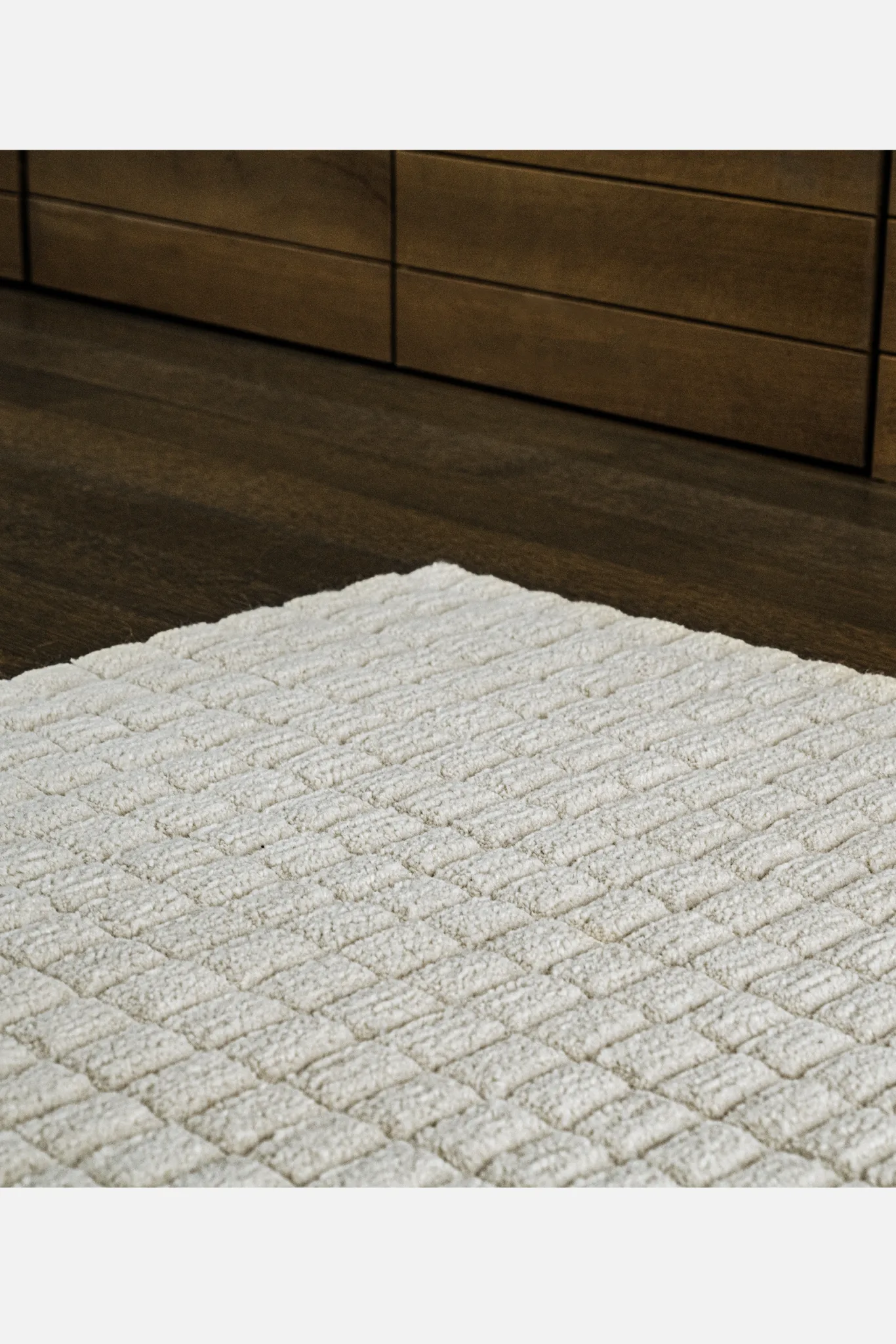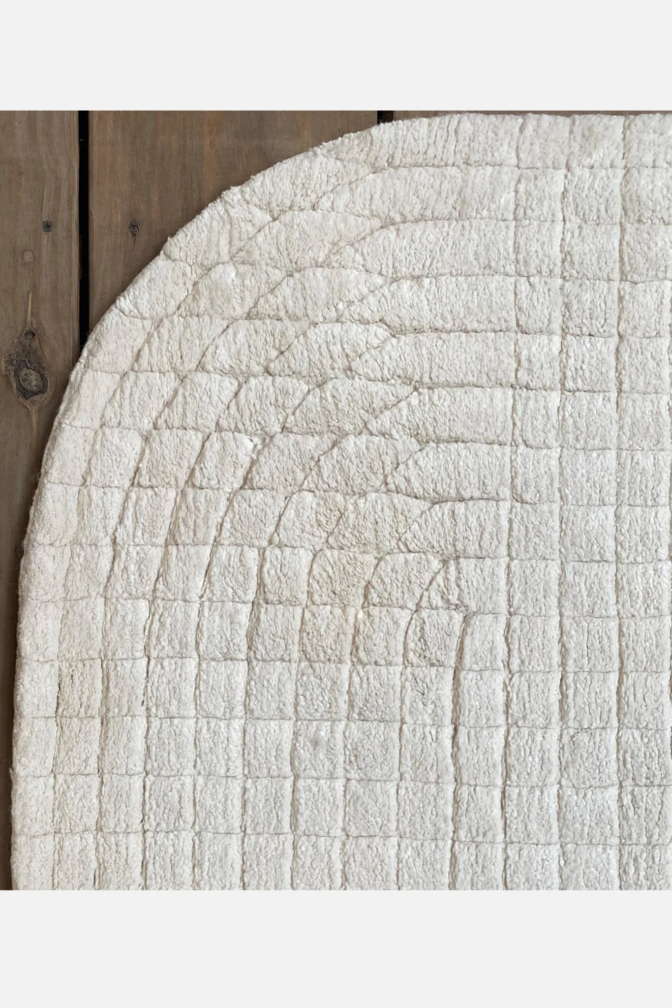 Multiple positively curved Alpaca squares blossoming over, and collapsing into, negative space Linen soumak.