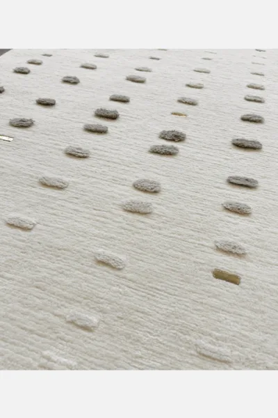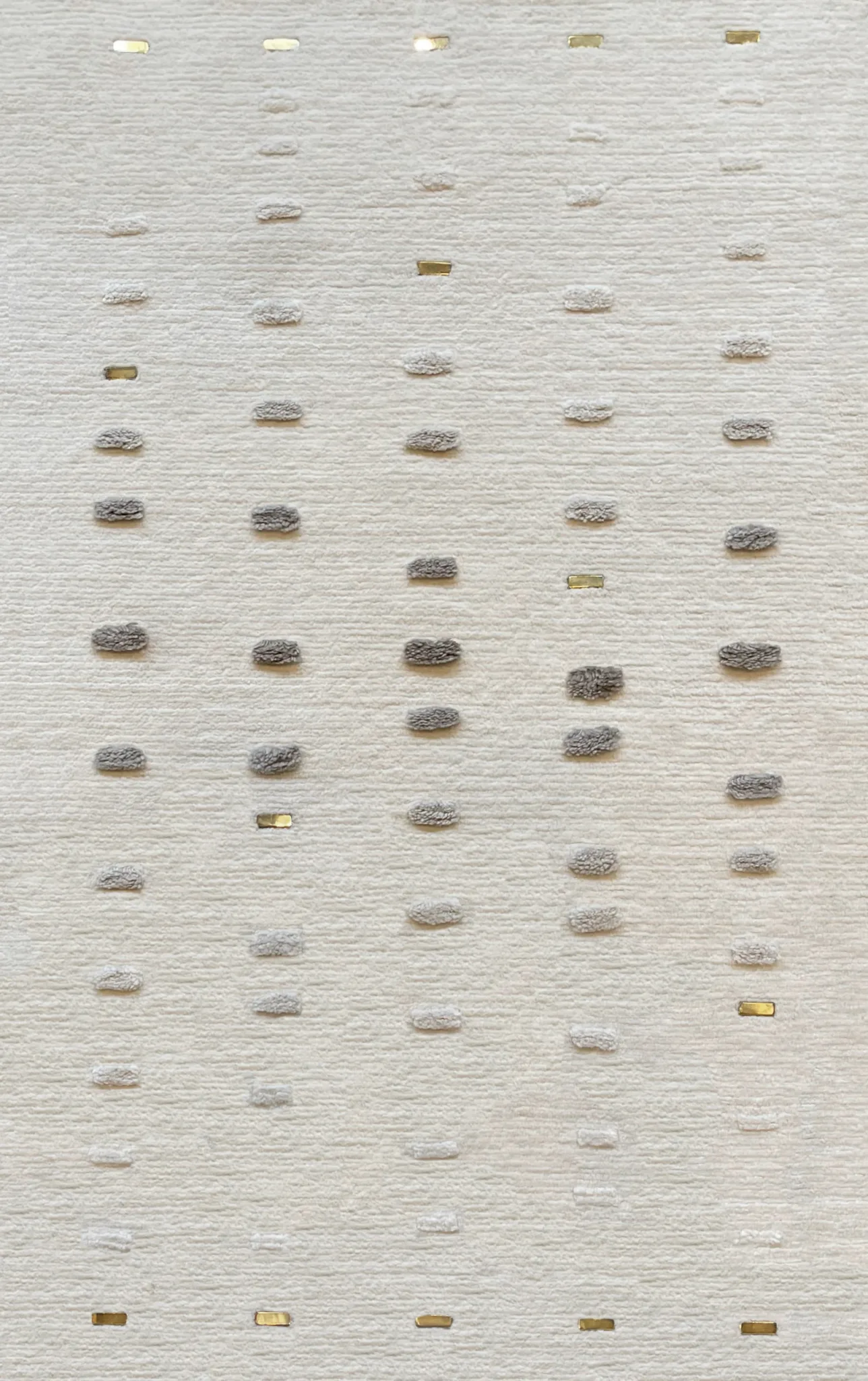 Irregular lines of ever-more-blossoming high-pile alpaca ombre tufts, studded with polished inlays. Conceived in a late night on-loom experiment.