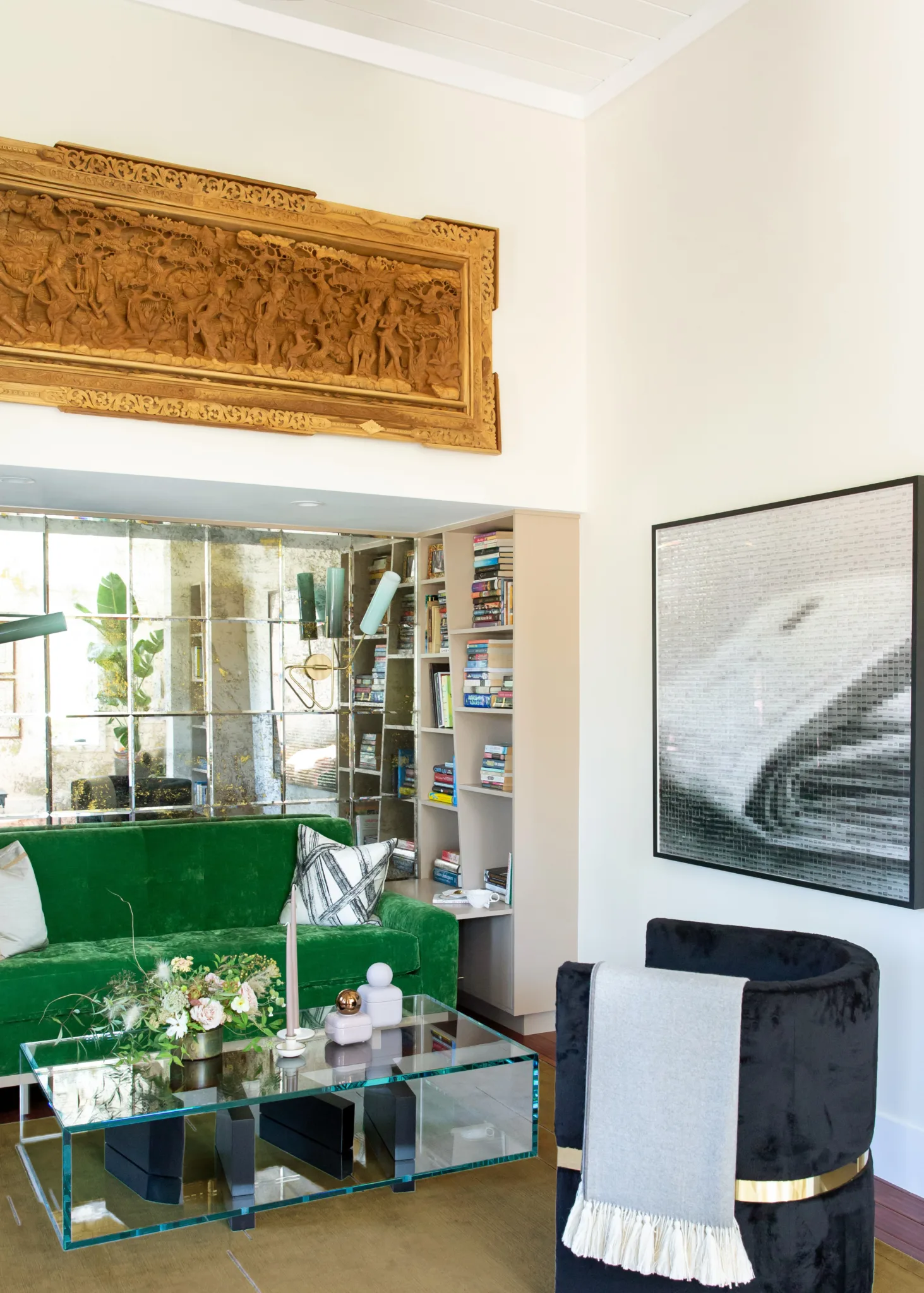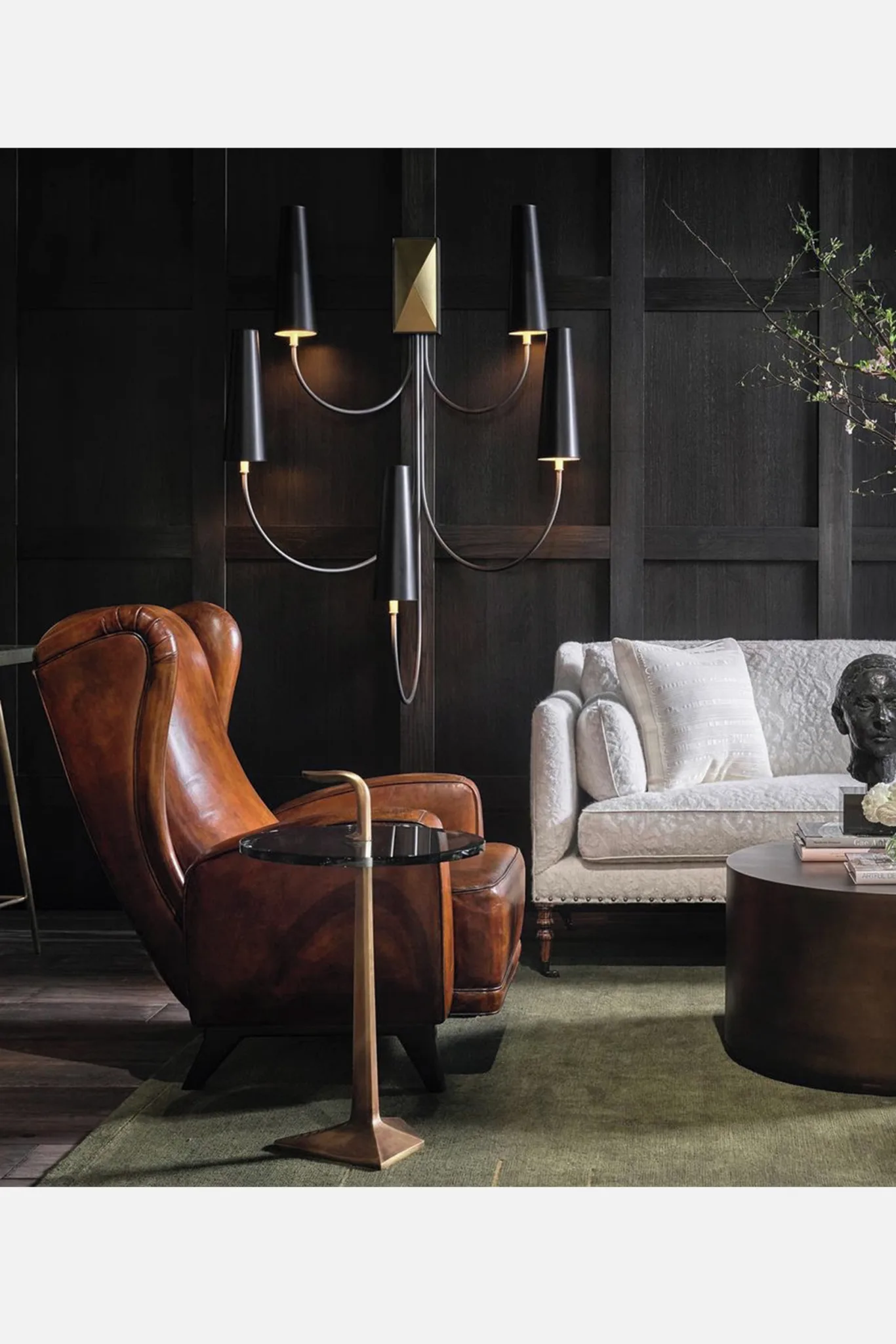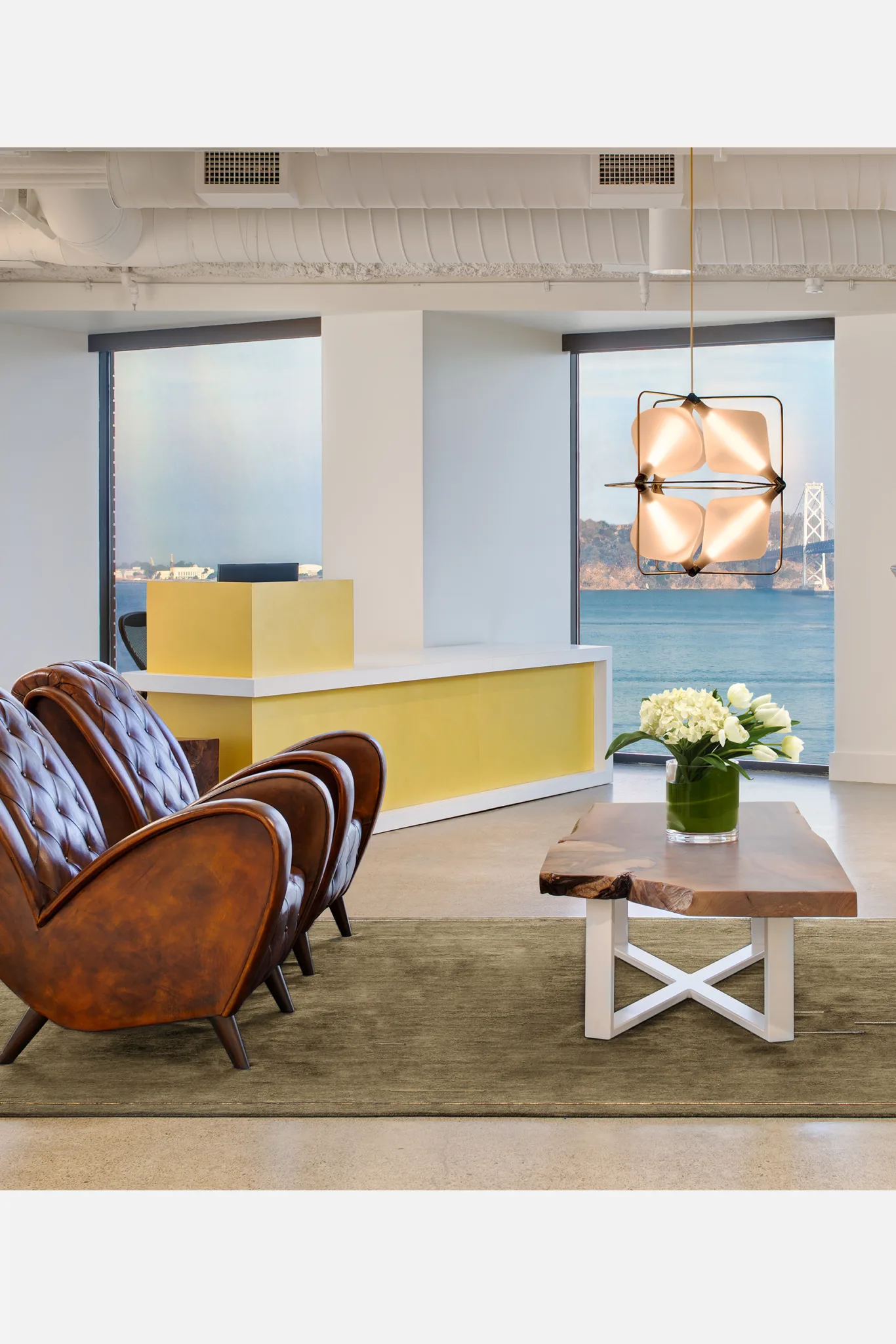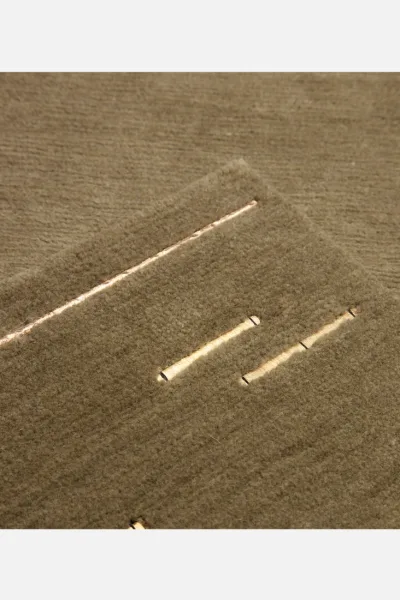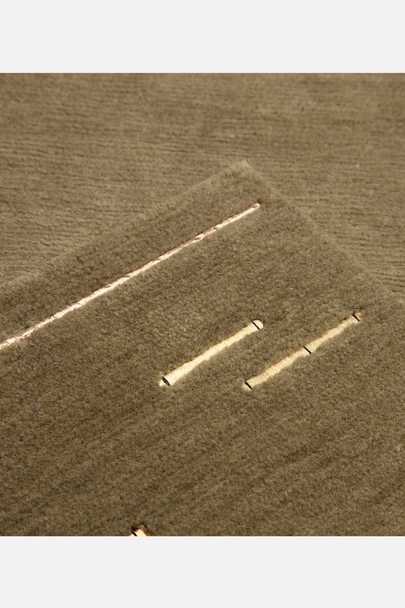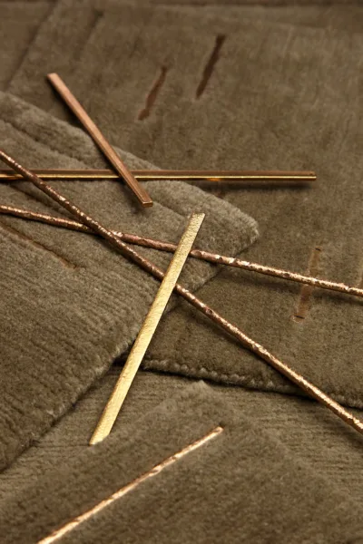 Hand-scraped metal bars embedded in pile comprised of hand-spun Alpaca, Mohair, and Merino yarn, and capped with carved metal rods.