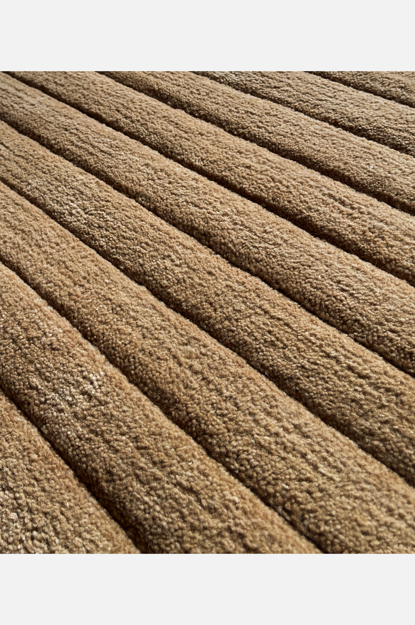High cut pile of Alpaca arranged in broad bands with alternating Hemp soumak troughs. This design uses the natural loft of Alpaca and negative space between to form an undulating texture.