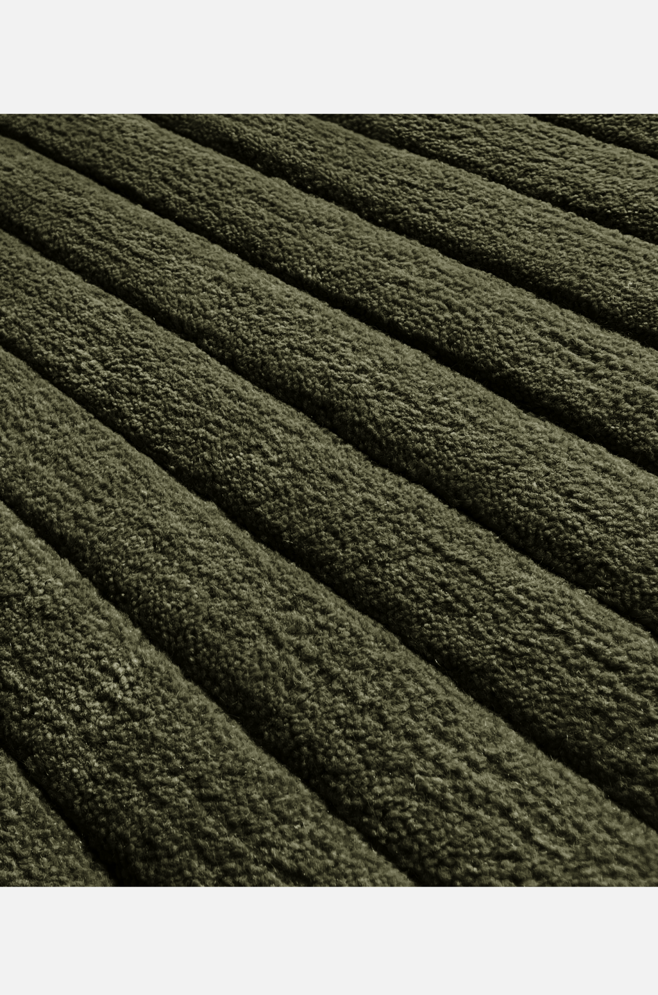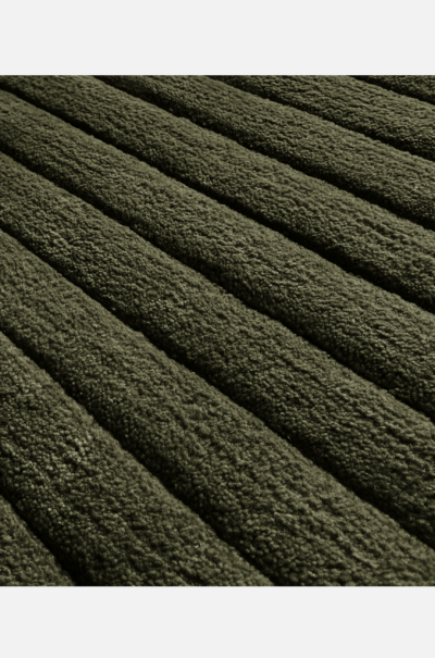 High cut pile of Alpaca arranged in broad bands with alternating Hemp soumak troughs. This design uses the natural loft of Alpaca and negative space between to form an undulating texture.