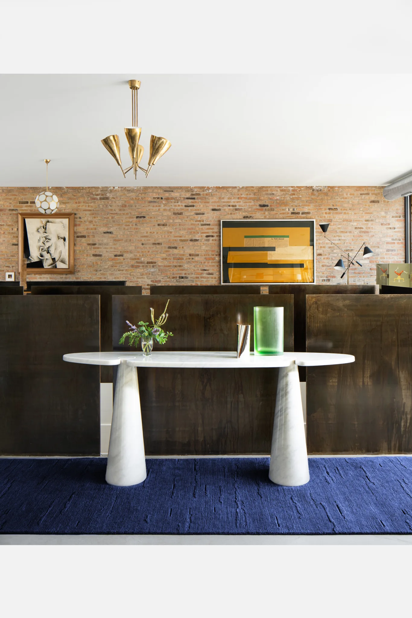 Cloud bands emerge from blossoming raised pile, casting shadows through inversion. Organic forms contrast with quadrate metal inlays.