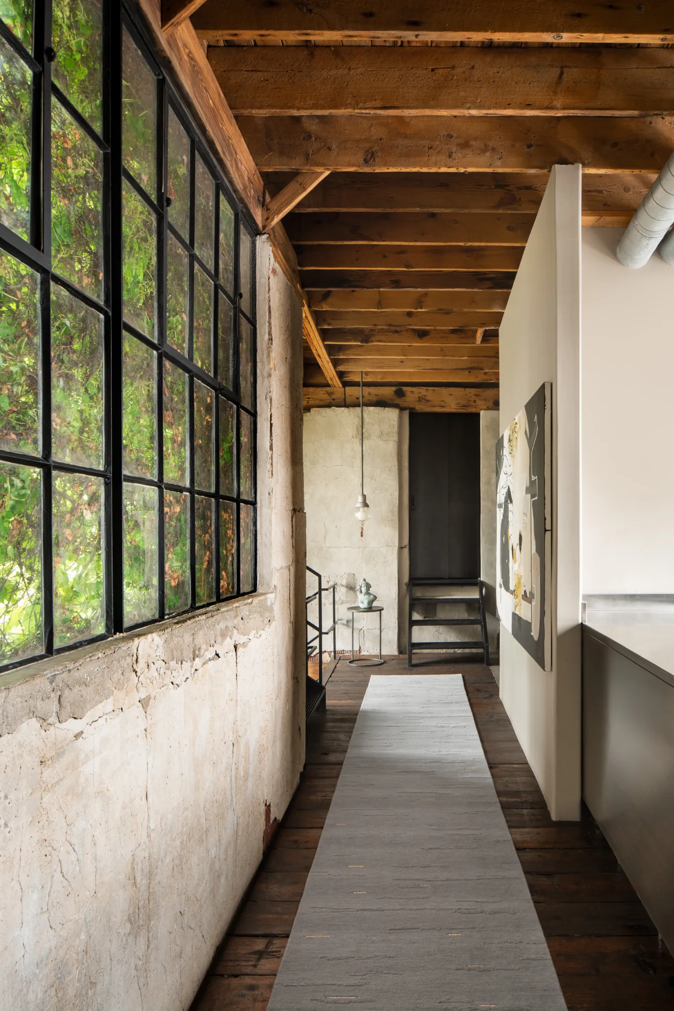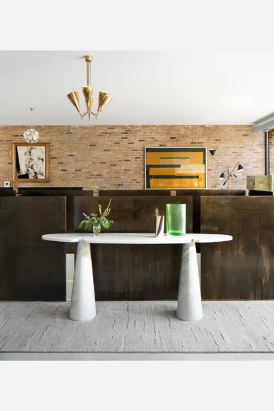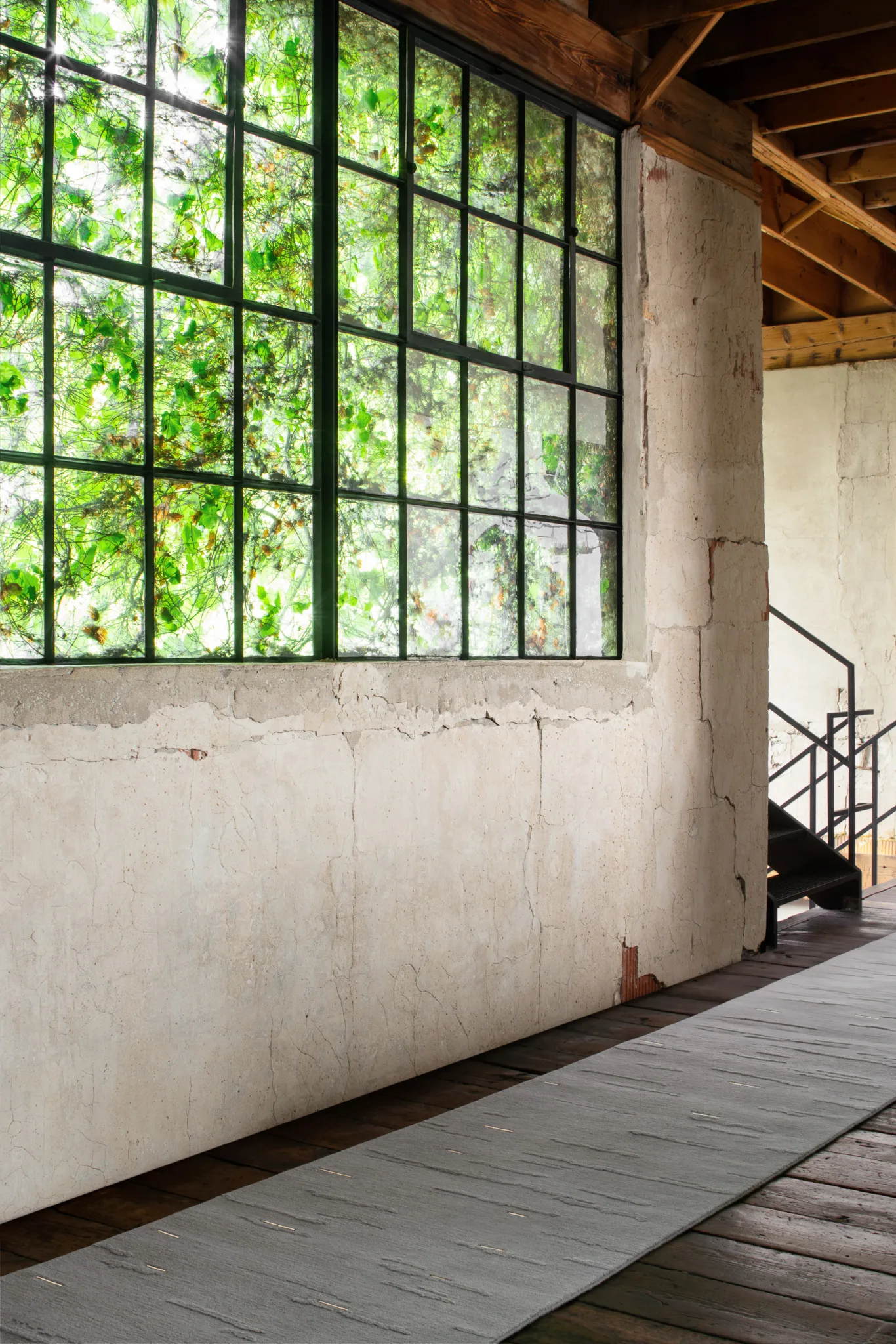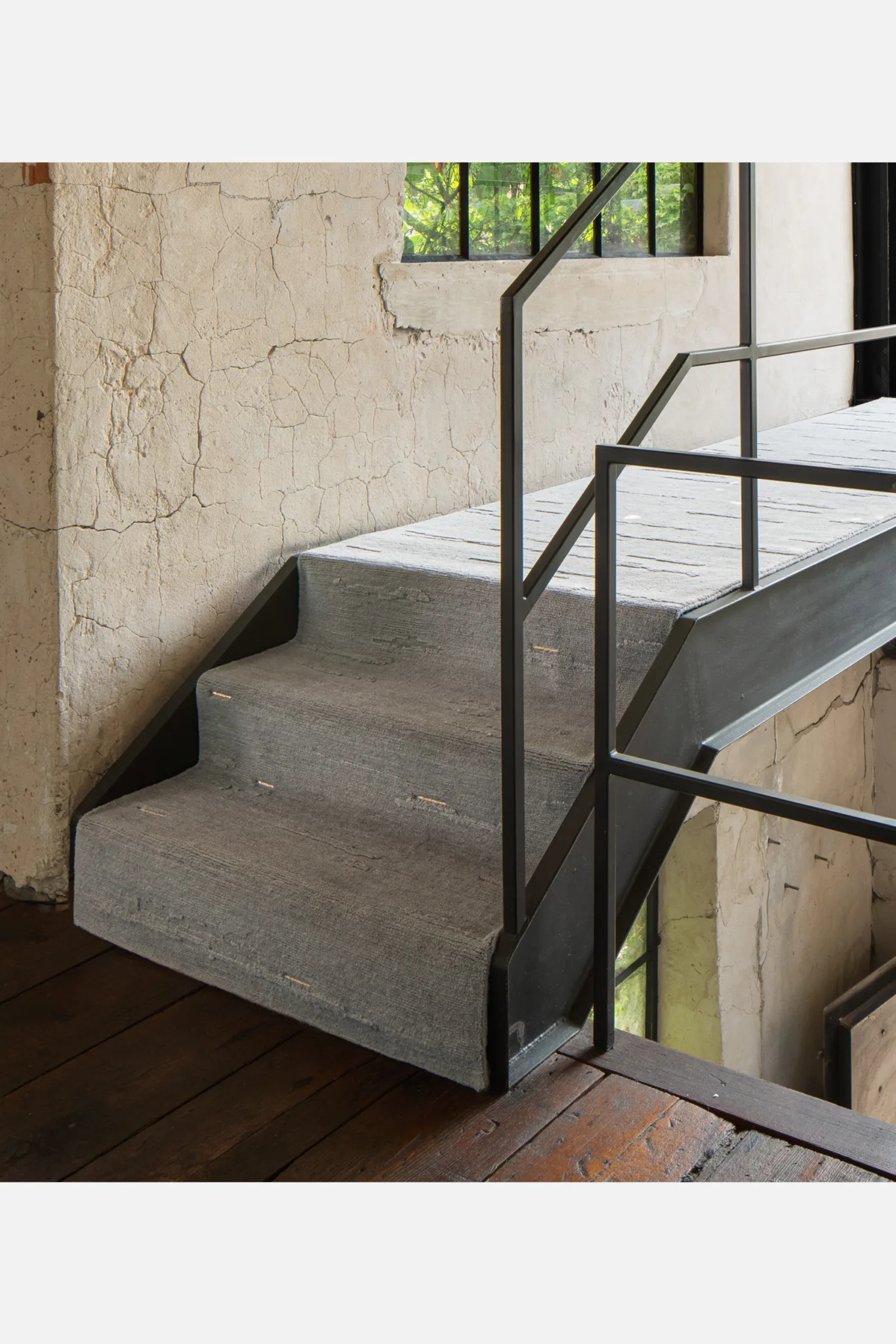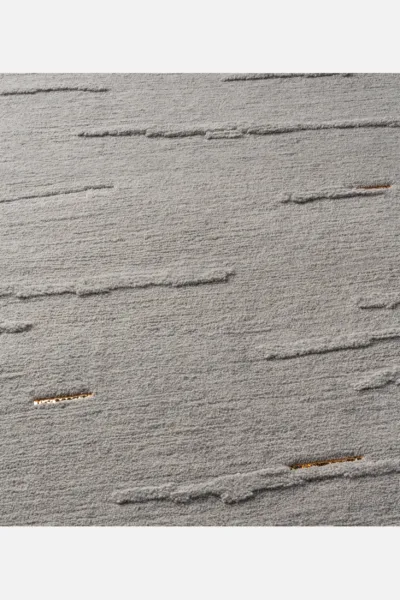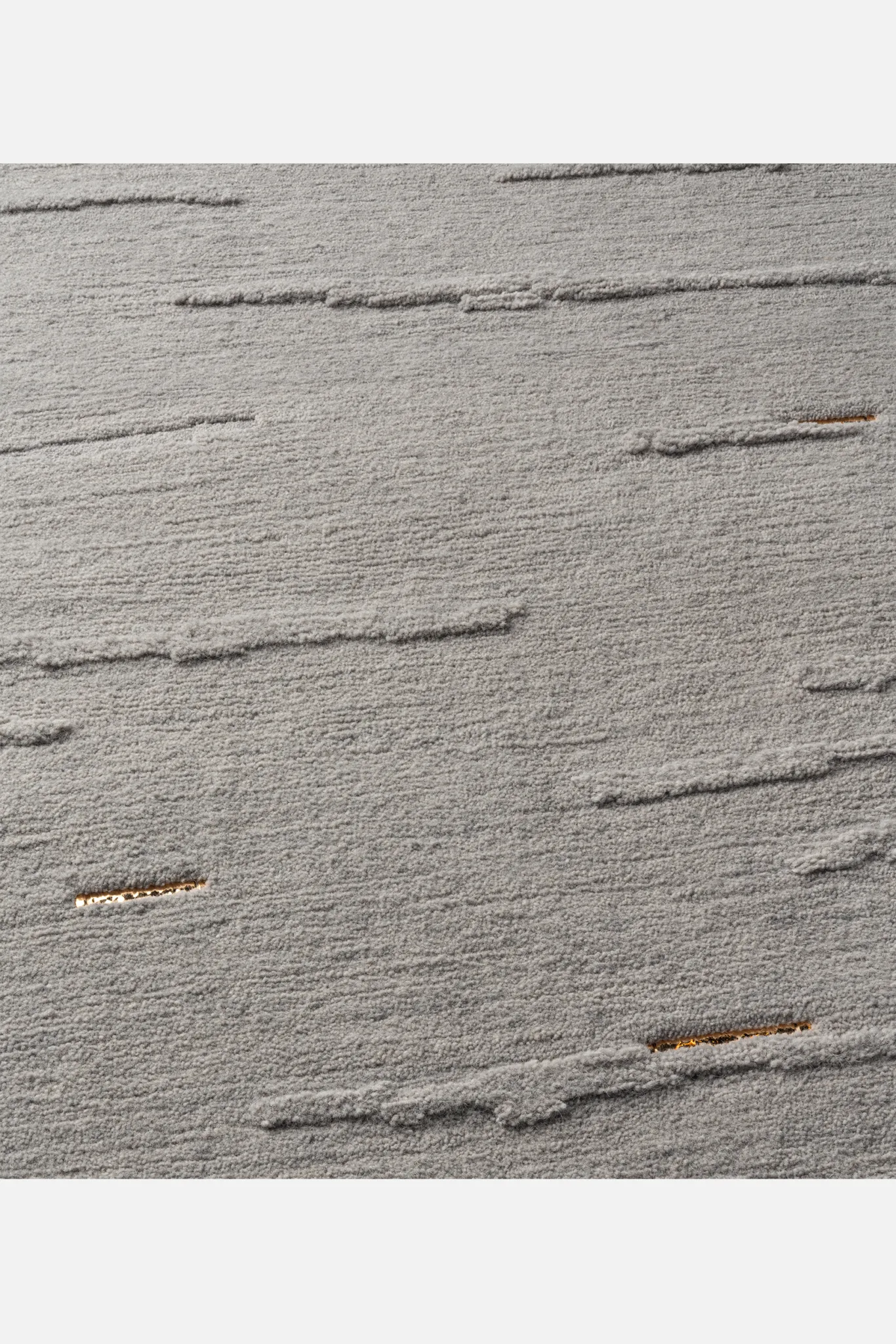 Cloud bands emerge from blossoming raised pile, casting shadows through inversion. Organic forms contrast with quadrate metal inlays.