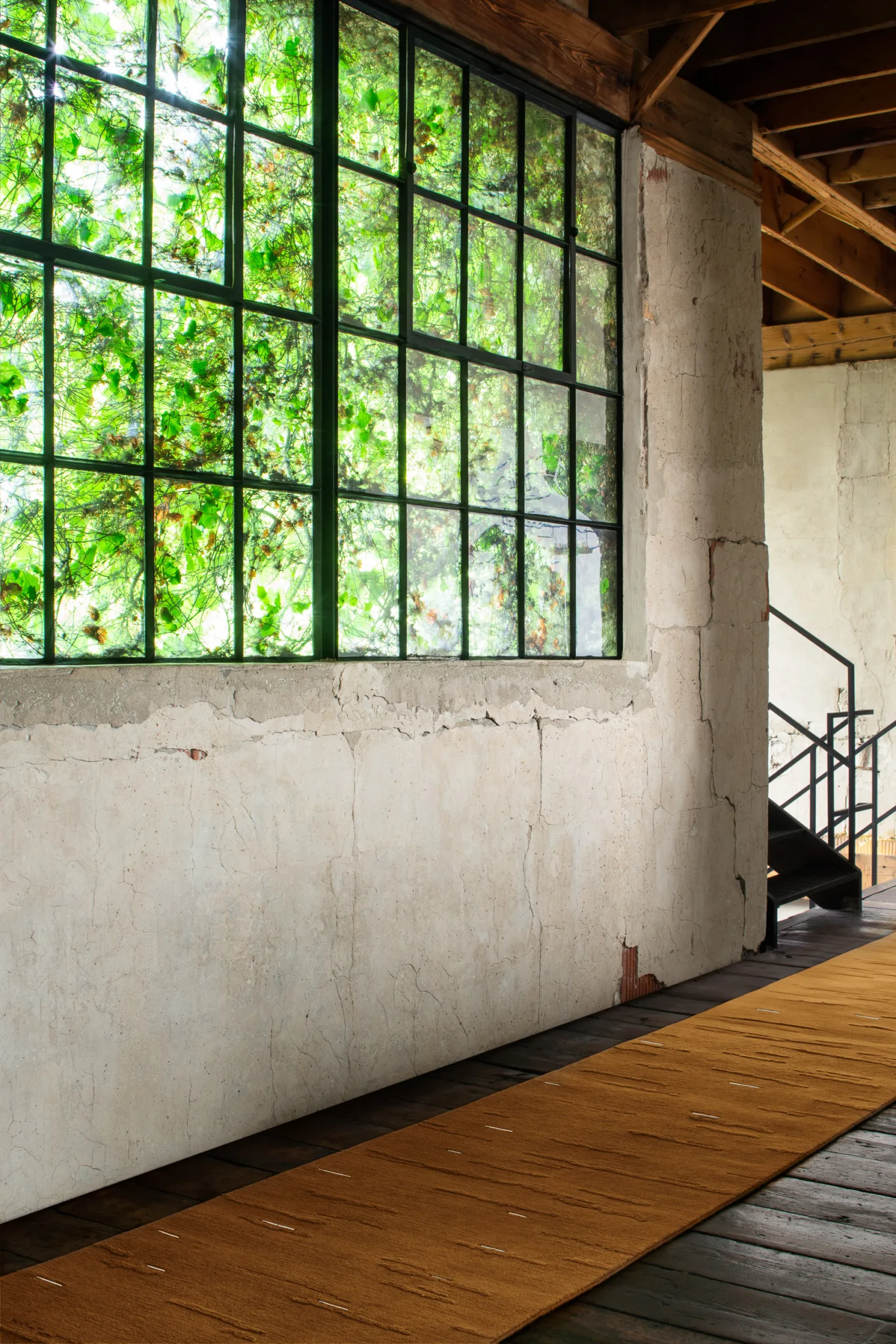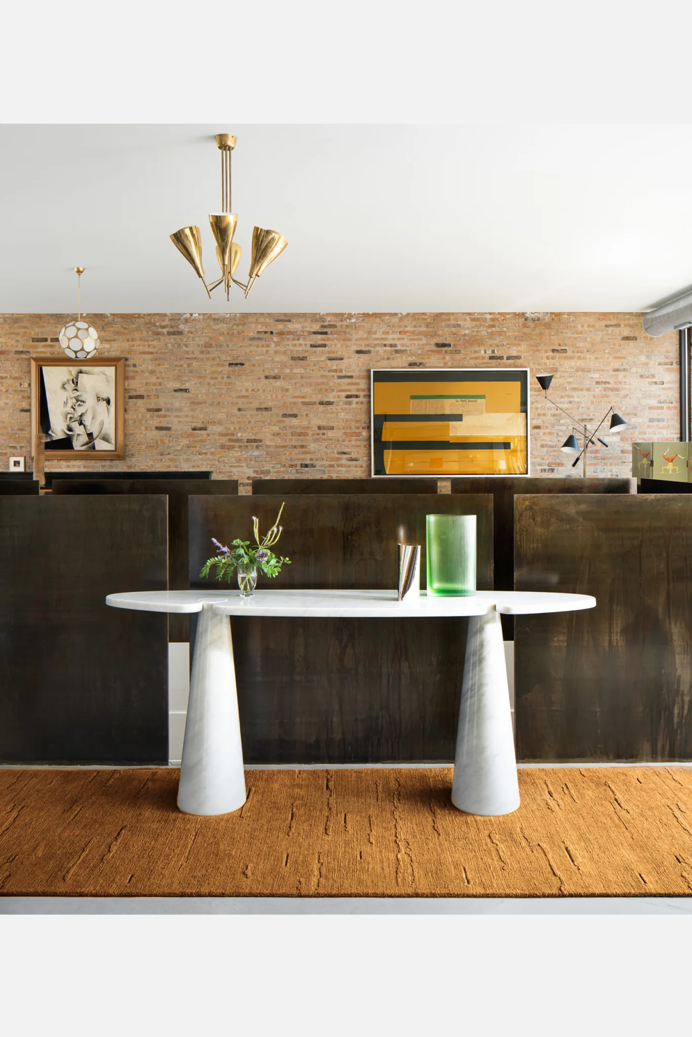 Cloud bands emerge from blossoming raised pile, casting shadows through inversion. Organic forms contrast with quadrate metal inlays.