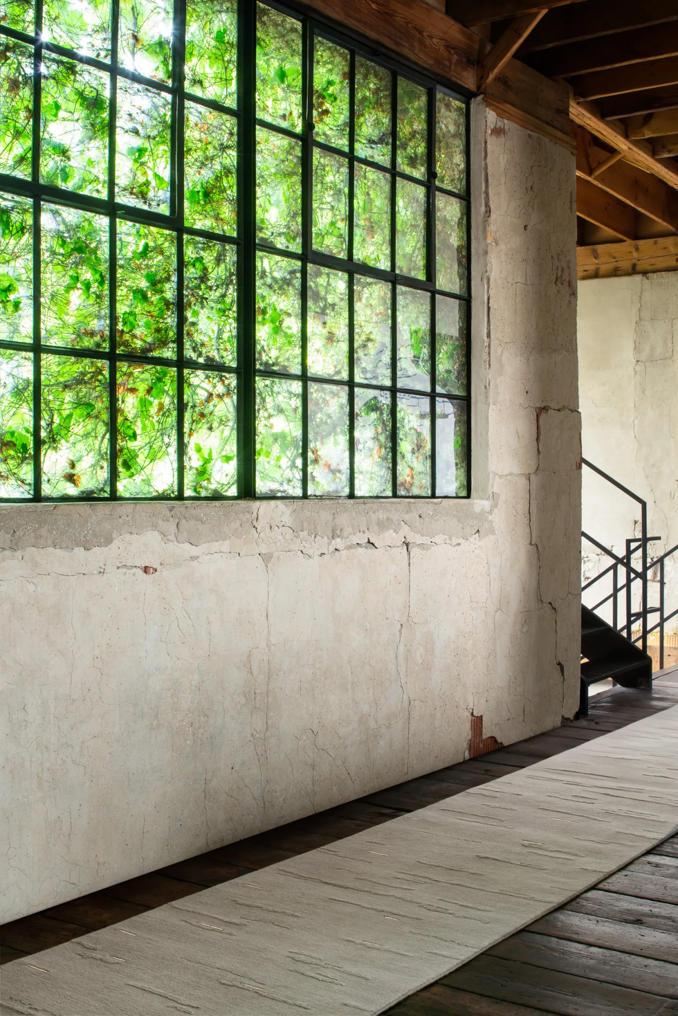 Cloud bands emerge from blossoming raised pile, casting shadows through inversion. Organic forms contrast with quadrate metal inlays.