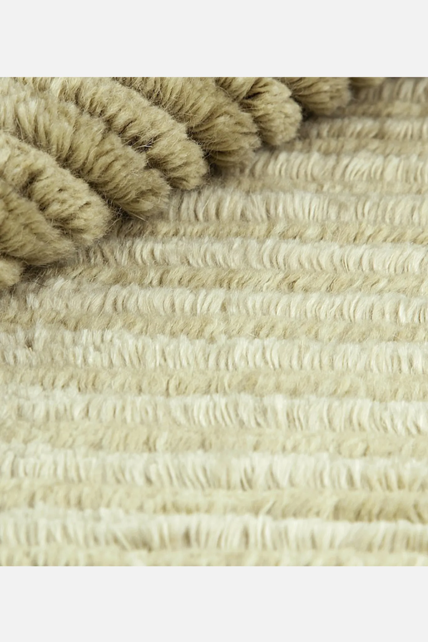 Alternating single row cut pile positions of Alpaca and blended Wool and Mohair, with double lines of single soumac. The design is capped with solid wool pile bands.